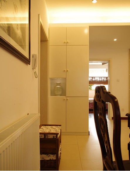 餐桌椅也是裝修前家里就有的,在這里被賦予了新的生命。為了配它,特地選購了后面的水墨畫,畫框是在當?shù)囟ㄖ频?。正好擋住配電箱。進門的玄關(guān)柜是白色的。