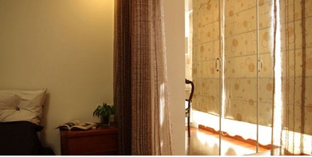 原先有一組傳統(tǒng)家具,一個三人位+兩個單人位實木沙發(fā)椅及茶幾、邊幾。為了更溫馨,也讓人坐進去更舒服和具備休閑感。我們把三人位實木沙發(fā)換成了藤制紅色布藝沙發(fā)。沙發(fā)是網(wǎng)購的,尺寸、藤編紋樣和布料都是精心挑選。當沙發(fā)送到現(xiàn)場當晚我就迫不及待去看,很滿意。沙發(fā)背景墻原先創(chuàng)意是水墨畫的藝術(shù)壁布,后來因為造價超預(yù)算決定放棄,現(xiàn)在看到的是請一個畫家朋友參照我們選的小樣而現(xiàn)場繪制的丙烯壁畫,沒想到出來的潑墨效果讓人驚嘆!客廳到西陽臺之間有兩扇移門,為了在移門開啟后能夠隱藏起來,特別設(shè)計了一組裝飾柜,顏色和飾品體現(xiàn)休閑文化與中國傳統(tǒng)文化的融合。沙發(fā)邊幾上的青瓷臺燈幾乎融入背后壁畫里。茶文化在中國源遠流長,試想在水墨畫中品著茶香的感覺是多么棒!