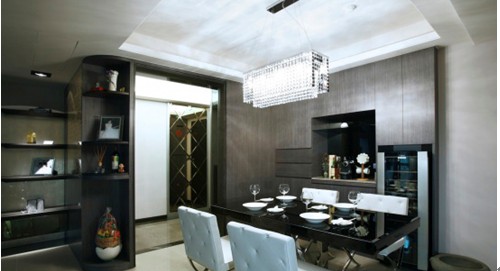 低調色彩是為了凝聚光明,凝聚精氣神,舉頭見空靈------白色水晶吊燈;環(huán)顧有低調------深色家具;