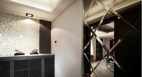 玄關的茶鏡開闊了空間,墻紙與木飾面的對比則市線條與塊面的結合;燈光再次成為光線的主角;