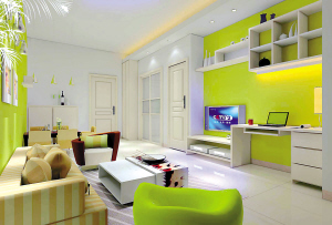 考慮房主是年輕活潑的女孩,明庭中采用活潑明亮的主色調(diào),把電視背景墻刷成果綠色。其余的功能也在這面墻上做文章:上邊設(shè)計(jì)了裝飾柜,緊鄰小電視柜旁邊再并排放書桌。空間利用充分、有序。