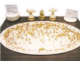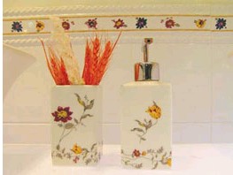 肥皂碟、牙刷杯等洗漱用品可以變成藝術品?你難以想象。然而,設計師就有足夠的想像力將它們演繹成陶瓷藝術品。肥皂碟呈現(xiàn)一個小小的扁圓形,有意思的是位于扁圓形中央的圖案設計?D?D?D一張自然攤開的紅楓葉,看上去就像秋天楓樹上不經(jīng)意間落下的一片楓葉,悄悄地在一個陶瓷小碗上安了家。楓葉的紅,陶瓷制品的晶瑩剔透,兩者融合在一起,確實給予衛(wèi)生間一種別樣的美感。