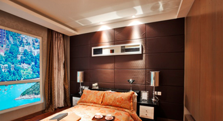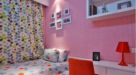 現(xiàn)代特征很明顯,窗簾與床上用品的圖案與紅色系列已經(jīng)很好詮釋了主人熱烈的現(xiàn)代情懷;