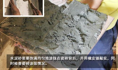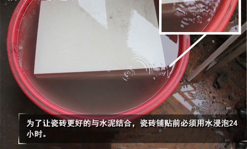 鋪貼瓷磚時,瓷磚與墻面的貼合度要大于自身產(chǎn)生的重力。因為瓷磚本身有許多小孔,吸水能力強(qiáng),干燥的瓷磚會吸干水泥的水分,使其貼合度降低,鋪貼后易出現(xiàn)空鼓和脫落。因此瓷磚必須浸泡24小時,至無水泡出現(xiàn),然后晾干再鋪貼。