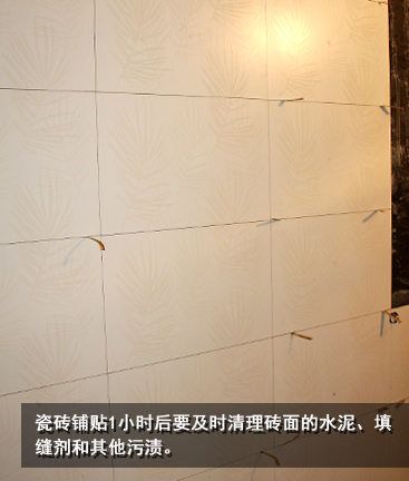 瓷磚鋪貼1小時后,要用毛巾將磚面的水泥、填縫劑和其他污漬清理干凈。切勿在事后再用鋼絲球清潔,這樣容易損壞磚面。