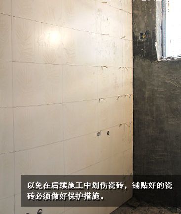 鋪貼瓷磚后,還會進(jìn)行一些后續(xù)的工程,為避免在施工中劃傷瓷磚,墻面鋪貼完成后必須對鋪貼好的瓷磚進(jìn)行保護(hù)??稍趬w下方的瓷磚鋪上包裝箱,在移動衛(wèi)浴用具和施工工具時,避免碰到磚面。