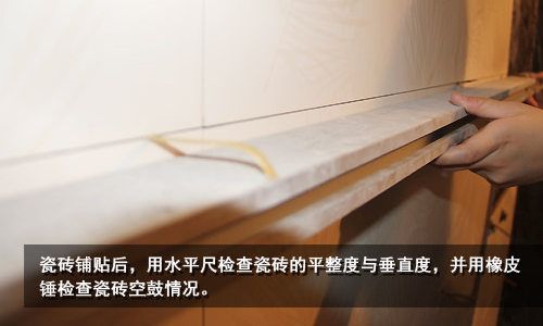 鋪貼完成12小時后,可用水平尺檢查墻面的平整度與垂直度,并用橡皮錘敲擊瓷磚,檢查么快磚的空鼓情況,發(fā)現(xiàn)空鼓要立即返工。