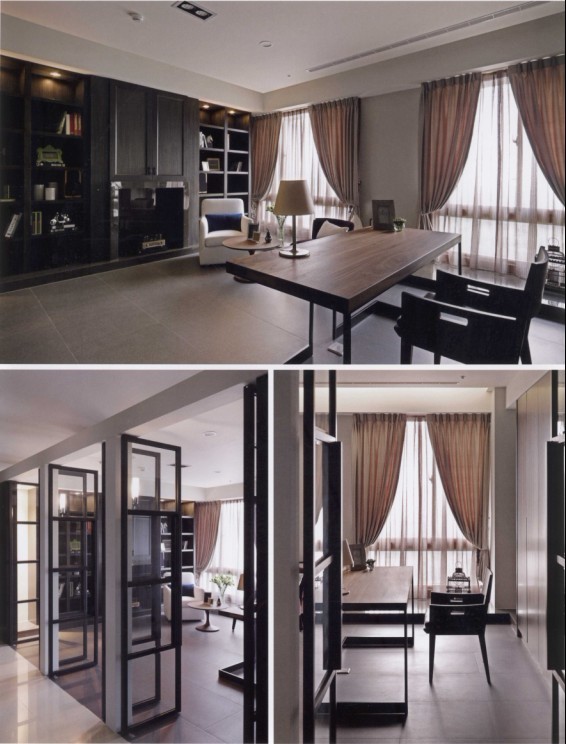 考量到未來使用性,將三房中的一房放大作為書房。深色基底以淺色軟件為主軸,構(gòu)筑出開放式書架造型,輔以奢華卻線條極簡的壁爐,創(chuàng)造出美式現(xiàn)代感的書房空間,也讓屋主音響收藏有了適當?shù)陌才拧?/p>