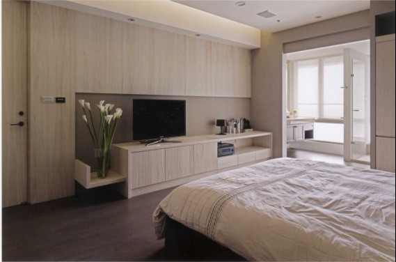 臥室里的墻壁都采用米白條紋,這是一種簡約的溫馨表達方式。木皮裝飾手法現(xiàn)在其實很少見,裝修出來的效果是既省成本也很健康。簡約裝修手法符合人們對于輕裝修重裝飾的這一理念。