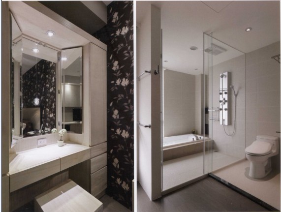 很少人家會在衛(wèi)生間的地面用地板,這家卻是,因為它真正做到了干濕分區(qū)。每一個可能占到水的部分都以巧妙挑高的手法分隔開來,既能美化空間,又實用之及。
