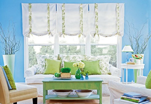 粉綠色充填在以藍色為主調(diào)的空間內(nèi),使得客廳空間風格轉(zhuǎn)變?yōu)猷l(xiāng)村式風格。沙發(fā)上嫩綠色的靠枕和白綠色相間的花紋大靠枕,形成了統(tǒng)一的色調(diào),花草的圖案,木質(zhì)的家具都體現(xiàn)出田園的風格。室內(nèi)鮮亮色彩的搭配保持著房間的輕盈通透感。嫩綠色沁人心脾,很適合夏季居室色調(diào),更貼近大自然的感覺。