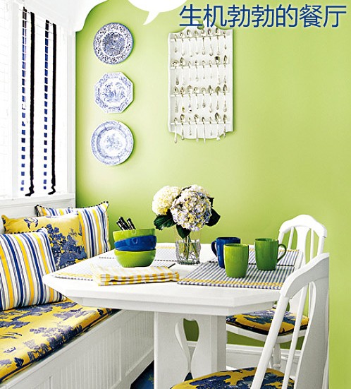 柳綠墻體映襯白色亮光漆面家具,即便在小面積的居室中,也能顯得舒適和現(xiàn)代。帶有花卉或條紋圖案的黃色靠墊,能起到點睛作用,青瓷圖案把這些色彩貫穿在一起。