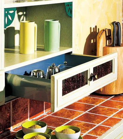 有些廚房的工作臺、櫥柜在設計時有一些轉角,其實這也是一個很好的利用空間,大有文章可做。旋轉式網(wǎng)架是最富有創(chuàng)意、最科學的設計,他通常是利用櫥柜的死角,可以讓你充分利用有限的空間??梢栽谵D角櫥柜中安裝一個旋轉式網(wǎng)架,放置鍋具。使用時只需輕輕一轉,就可以拿到需要的物品,十分簡單方便。