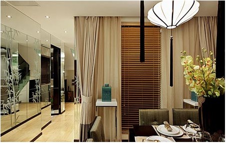 客廳內(nèi)中式簡(jiǎn)約的茶幾造型,在幾片綠葉地毯的襯托下,渲染了清靜無為的到家思想,茶亦有道,禪意十足。相對(duì)于此處濃烈的人文氛圍營(yíng)造,餐廳的陳設(shè)擺放就比較素雅,餐桌椅擺放位置利用玻璃鏡面形成景觀呼應(yīng),表現(xiàn)出小空間的體量擴(kuò)展,又以小配件搭配擺設(shè),構(gòu)應(yīng)出生活的氣氛。中式元素的引用是表現(xiàn)主題思想的一個(gè)手法,客廳的時(shí)尚地毯,取自于竹紋圖案,與鏡壁相呼應(yīng)。在色彩上主要以沉穩(wěn)的調(diào)子為主,并作局部突出的點(diǎn)綴,統(tǒng)一于潛藏中式環(huán)境中。新東方讓居室空間有了詩情畫意/韻律美感,倡導(dǎo)了生活的藝術(shù)新潮。