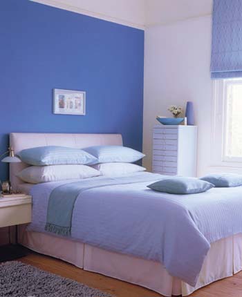 主題墻面為色彩鮮明的水藍(lán)色,墻壁正中是白色小像框,其余墻壁采用灰色,很好地襯托了主墻面。  地面是純橡木地板,地板上鋪以Laura Ashley 的長(zhǎng)絨地毯。      Argos 床上鋪以白色床單和藍(lán)色薄被以及藍(lán)色枕頭,床邊柜上擺有藍(lán)色托盤和藍(lán)色花瓶,繼續(xù)強(qiáng)化主題色調(diào)。  白色床邊桌上擺有鬧鐘和造型精美的臺(tái)燈,現(xiàn)代感十足。   總體感覺(jué)藍(lán)色灄人心魄,其余色調(diào)的搭配是對(duì)這種感覺(jué)的提升。