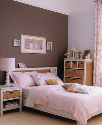 Crucial Trading 的羊毛地毯依然是以灰白色呼應(yīng)主題。  Elanbach 窗簾,Havana 床,床上鋪以粉色床罩和白色枕頭以及棕色、白色帶花紋小墊子,粉色作為整體布局中唯一的亮色,十分搶眼。 床邊白色小桌和白色小柜,均帶藤制抽屜,小桌上Cath Kidston的臺(tái)燈白色支架和粉色燈罩,柜上飾以白色燈籠和數(shù)朵鮮花。
