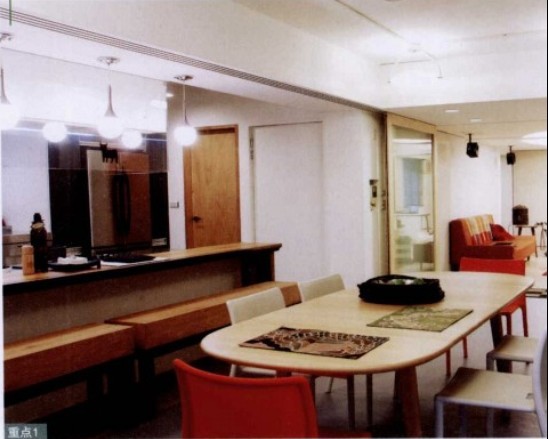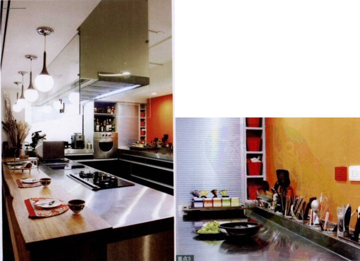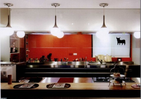 以日式居酒屋為概念設(shè)計的廚房吧臺,讓屋主可以邊下廚連跟朋友聊天??紤]到廚具以不銹鋼為主,為化解冰冷感,特別以紅色來中紅。而廚房的電器,都以嵌入為主。