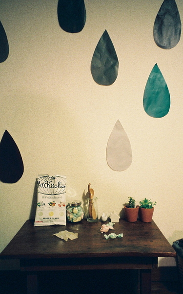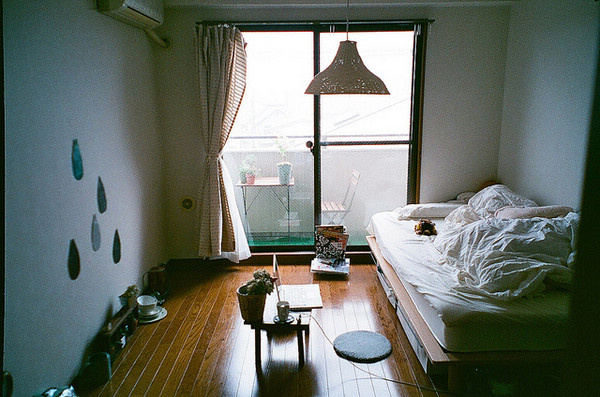 這個稍顯零亂的臥室正是MM的臥室,真正的席地式生活、赤腳、坐在薄薄的小軟墊上寫作業(yè)瀏覽網(wǎng)頁都是她一直以來的生活習慣。簡約的居家裝飾,沒有多余的家具,墻面上出現(xiàn)的水滴裝飾還是MM自己隨手剪的彩紙而已。