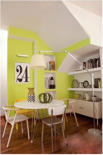 黃綠色的墻面清新自然,白色餐桌上的圓形裝飾品可愛活潑,充滿俏皮的味道。清新的綠色助力春日餐廳。