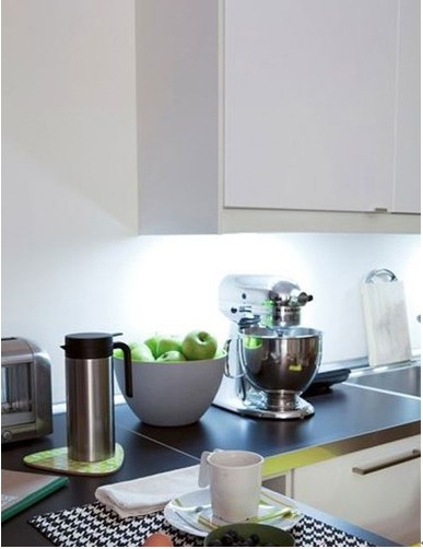 隔板條形廚房,一個小巧的吧臺很有小資氣質(zhì)。綠色的餐具,讓你在早餐時間充滿愉悅。綠色的蘋果也很是誘人。