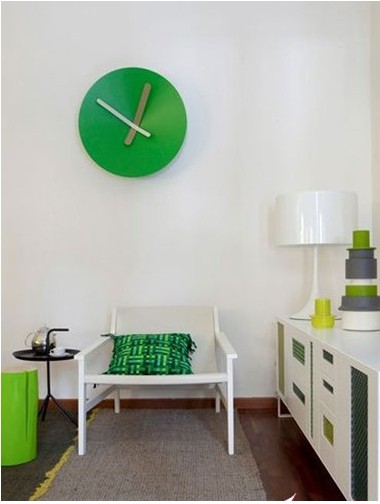 一款綠色掛鐘為白色墻面增春色。座椅上的格紋綠色靠包在白色座椅上也是格外醒目,一上一下的綠意,很有層次感。