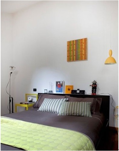 臥室用到淡黃色毛毯營造出小清新,深棕色的床品穩(wěn)重富有質(zhì)感,淺色與深色的搭配賦予層次感,艷黃色輕巧的床頭柜布置恬淡清新。