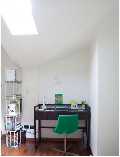 黑與白的搭配成就了書房的氣質(zhì),綠色的靠椅姿態(tài)輕盈,搭配造型別致的桌面裝飾品,用輕巧生動的姿態(tài)讓書桌區(qū)充滿春意和詳和。
