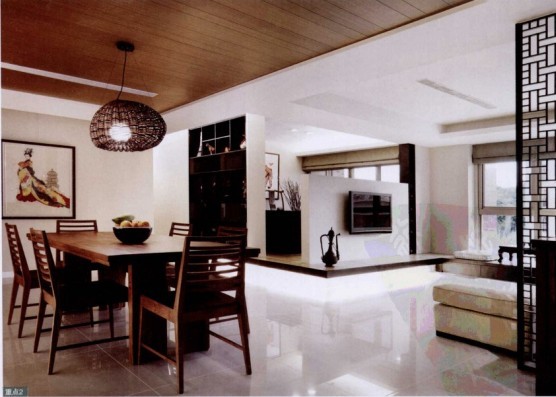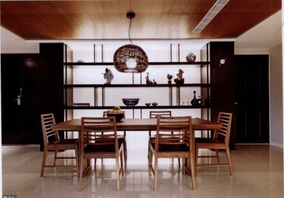 餐廳上方是不規(guī)則侵害的實(shí)木天花板,線條簡潔的深色展示柜,主角刻意留給柜子上各個(gè)不同形狀、材質(zhì)的藝術(shù)品,低調(diào)的柜子讓中國味十足的各種瓷器、杯盤高調(diào)地展示。