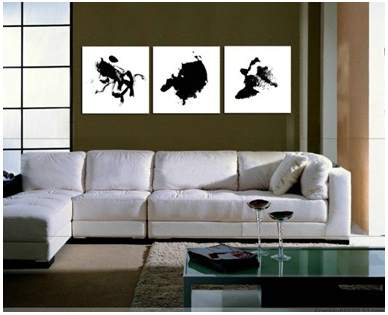 3:裝飾畫的懸掛位置和色彩一般在與電視墻相對的墻上,即背靠沙發(fā)的墻上,會裝點1至3幅裝飾畫。由于沙發(fā)通常是客廳內(nèi)的主角,在選擇客廳裝飾畫時常常以沙發(fā)為中心。中性色和淺色沙 發(fā)適合搭配暖色調(diào)的裝飾畫,紅色等顏色比較鮮亮的沙發(fā)適合配以中性基調(diào)或相同相近色系的裝飾畫。色彩基調(diào)一致、畫面內(nèi)容接近、裝裱樣式規(guī)格相同的系列畫是客廳內(nèi)的首選。這樣整個客廳既顯得富于變化又不至于雜亂無章。