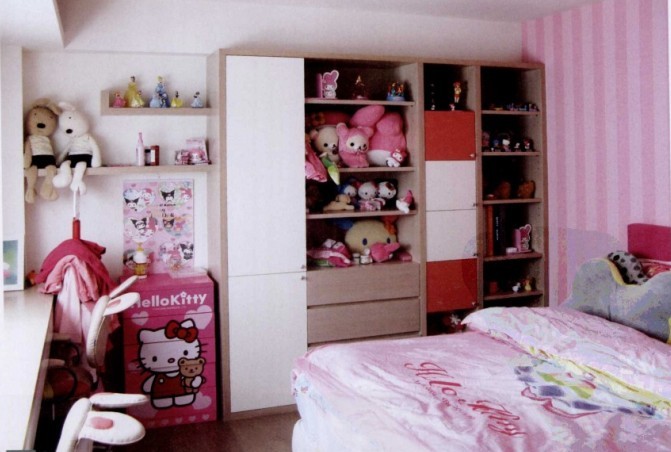 小女孩都喜歡布偶,設(shè)計(jì)師選擇粉紅色作為空間的主色,為布偶設(shè)計(jì)了收納展柜,并用白與紅的門片跳色,讓布偶成為公主房里最好的裝飾風(fēng)景。