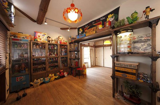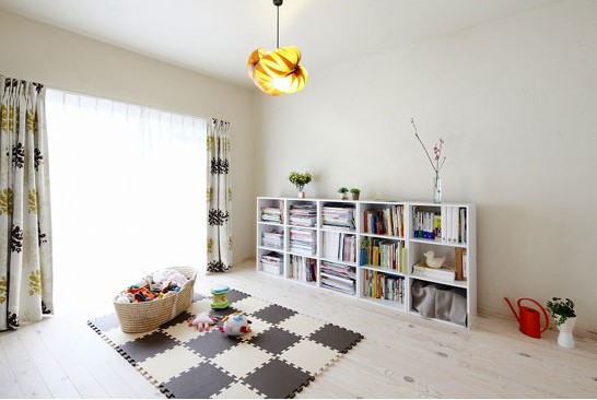 外部造型似向日葵的吊燈,樣式別致,散發(fā)的燈光柔和不會(huì)讓人覺(jué)得耀眼。深棕色的百葉窗與木質(zhì)地板和儲(chǔ)物柜一起營(yíng)造出夢(mèng)幻般的溫馨世界。門(mén)兩側(cè)的多層開(kāi)放式儲(chǔ)格,為體積不同的模型分別找到了安放之處。而開(kāi)放式的形式,也增加了空間的利用度。頂層擺放多個(gè)玩偶模型,既讓孩子覺(jué)得生動(dòng)有趣,又會(huì)降低木質(zhì)材料帶給孩子的壓迫感。