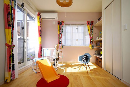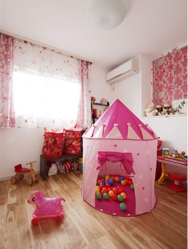 粉色的墻壁打造出柔和輕松的基調(diào)。紅黃色相間的卡通窗簾,很符合孩子們的口味,也讓空間的顏色變得不再單一。因?yàn)榉块g面積有限,角落用隔板改造成開(kāi)放式的儲(chǔ)物區(qū)域,既不會(huì)顯得空間沉悶,也避免了玩具過(guò)多帶來(lái)的凌亂。房間中央擺放了孩子喜歡的小滑梯,可愛(ài)的玩偶,色彩鮮明,童趣十足。