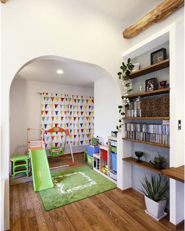 開(kāi)放式的拱形門(mén),既不會(huì)讓空間的過(guò)渡變得突兀,又很好的增加了房間的延伸度,不會(huì)給人狹小的感覺(jué)。柔軟的綠色地毯既與小型的滑梯和秋千色彩融合,也增添了孩子玩耍時(shí)的安全感。彩色旗幟的窗簾頗具特色,既有實(shí)用性,也符合了孩子喜歡鮮艷事物的口味。木板打造的簡(jiǎn)易書(shū)架,與綠色植物的裝飾更為空間整體添加了自然的氣息。