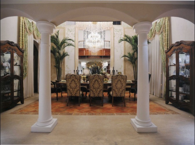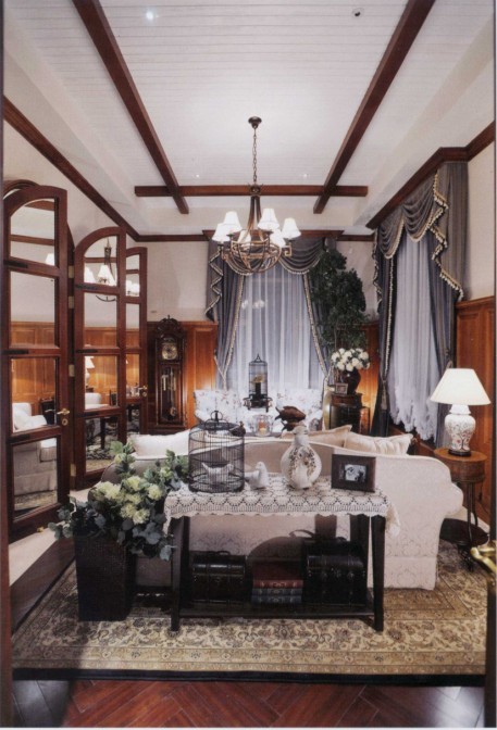 圓拱形門洞、門以及窗的別墅設(shè)計,在第一時間將人們帶入了一個溫馨而優(yōu)雅的居室環(huán)境。本套案例的設(shè)計以咖啡色為基調(diào)色,點綴一些暗紅色,使得整個空間的貴氣有了很大程度地提升。柔軟的暖色調(diào)燈光,使得家具與家具,空間與空間之間的流線更加自然、流暢。大型旋轉(zhuǎn)樓梯給傳統(tǒng)的空間帶來了動感。客廳中的假窗裝飾是室內(nèi)設(shè)計的一個亮點,它與客廳門的造型相得益彰。同時,穿入戶上的玻璃用鏡面來代替,使得室空間在鏡面的反射下,得到了視覺上延伸和擴展,也給這個看似規(guī)整的客廳增添了異樣的生活趣味。