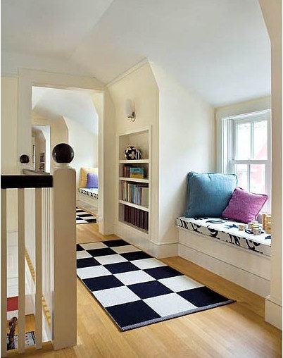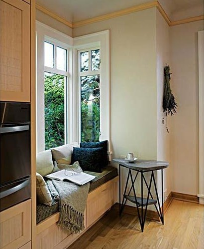 用柔軟的墊背營(yíng)造出舒適、溫暖的感覺(jué),旁邊加上的三角形小桌子,立馬在小小的空間內(nèi)獨(dú)立出一個(gè)休閑區(qū),可謂匠心獨(dú)運(yùn)。