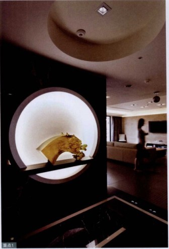 進(jìn)入大宅,出現(xiàn)在眼前的是這個(gè)圓形的玄關(guān)圖案。圓形的展示玄關(guān)以金龍石地板及墻面的華麗,搭配圓形展示面燈光,通過(guò)燈光的綻放突顯了業(yè)主收藏的琉璃雕塑,讓人一進(jìn)門(mén)就感受到空間的優(yōu)雅。