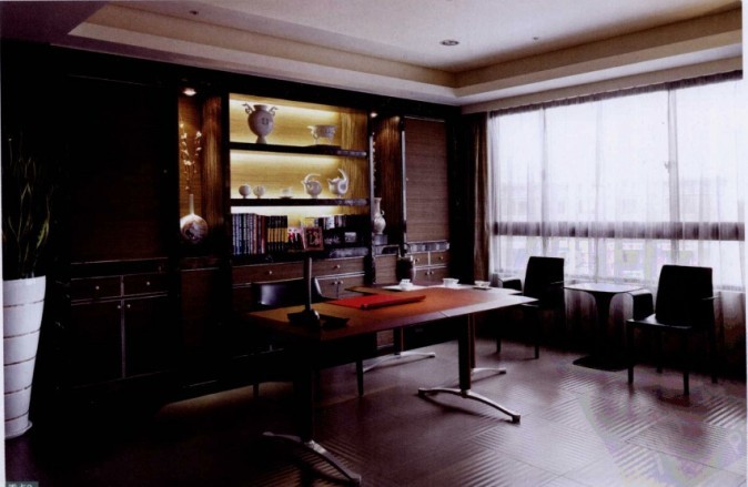 開(kāi)放式的書(shū)房連接客廳,選擇編織紋石英磚鋪成地板,展現(xiàn)出成熟內(nèi)斂的質(zhì)感。而書(shū)房也是用來(lái)洽談公務(wù)的空間,設(shè)計(jì)師結(jié)合收藏展示設(shè)計(jì)書(shū)柜,讓主人在洽談公務(wù)之余也能同商務(wù)友人一起賞玩自己的收藏品。