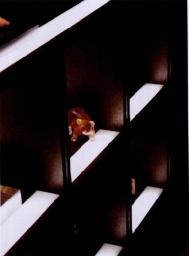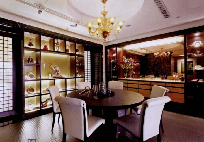 餐廳里的規(guī)劃著一排展示柜,擺放著主人的多年來(lái)的收藏品,有古董也有酒。展示柜的前端鑲嵌霧面玻璃片,下方的燈光帶出收藏品的質(zhì)感,帶出了主人的品位。