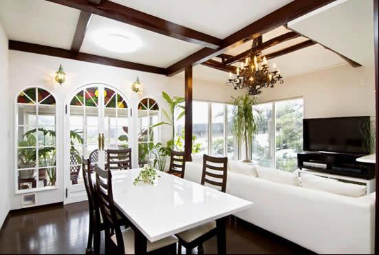 一、白色為基底,運(yùn)用地中海中的元素給空間增加一點(diǎn)品位和檔次。添加上歐式的吊燈,增添一點(diǎn)復(fù)古氣息,頂部與地面的顏色相呼應(yīng),空間的張力立刻顯現(xiàn)出來(lái)。在大面積冷色調(diào)的空間里用古色古香的木色和燈光給空間增添了點(diǎn)溫馨的韻味。幾盆綠色植物的裝飾給整個(gè)堅(jiān)硬的空間帶來(lái)了柔和感。在空過落地窗的點(diǎn)綴,整個(gè)空間明亮,與外界環(huán)境溶為一體,清新自然。
