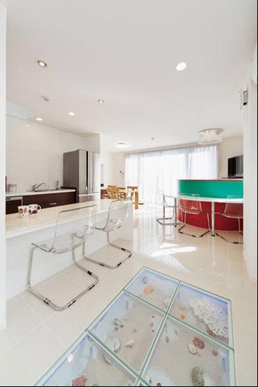 三、整個(gè)空間的通透感很強(qiáng),你會(huì)覺得這個(gè)空間很透氣。其實(shí)只是設(shè)計(jì)師耍了點(diǎn)小小的把戲。在這個(gè)空間里相信大家都注意到了地面采用了玻璃的形式,里面放點(diǎn)細(xì)沙、貝殼、珊瑚配上淡藍(lán)色的玻璃,會(huì)有種大海的感覺,這樣售房整個(gè)開放式的廚房地面不在單調(diào)。
