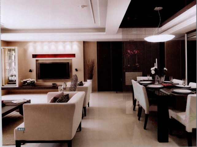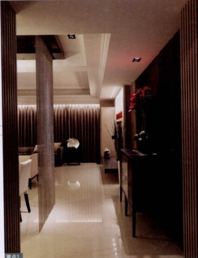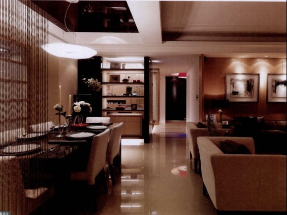 用溫馨的米**沙發(fā)跟墻面相同統(tǒng)一,深咖啡色的木質(zhì)家具與溫馨的米色搭配。讓客廳與餐廳都有一個溫馨舒適的居家氛圍。業(yè)主是個很有生活情趣的人,喜愛收藏。所以設(shè)計師從玄關(guān)開始就規(guī)劃了展示空間,隱藏式電視墻搭配局部展示柜,通過燈光及鏡面來突顯出收藏品的質(zhì)感。