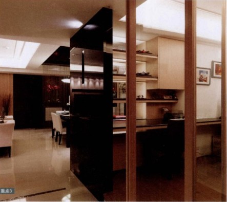 在位于走道旁的書房,為了讓空間更通透,設(shè)計師采用具有反射作用的烤漆玻璃,以及有加大空間效果的玻璃門,營造出開放式的寬敞感。以層板高低排列的展示書架,又成為書房與餐廳的隔斷。