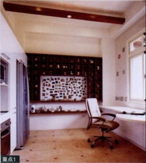 象牙白的空間,地上是復古磚,讓簡約的空間增添一絲質(zhì)感。廚房里最大的特色不是地面磚與空間色調(diào)的配合,而是廚房空間的墻面,設計師以集成材設計出格狀的馬克杯展示架,中間還有磁石板,可以貼上屋主收集的珍貴磁鐵。最搶眼的設計不是精致造型,而是實用到位的小道具,宜家宜居。