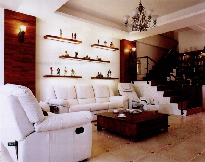 在氣氛和諧舒適的客廳,沙發(fā)后方主墻上下都有打光的層板,展示屋主旅游時收集的紀念品。階梯下方,可收納行李箱及大型換季電器。客廳家具以簡約實用為主,沙發(fā)為白色的布藝,難清潔的讓人吃驚,偏愛鄉(xiāng)村風格的業(yè)主卻不愛花朵,只追求自然舒適。