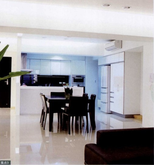 廚房與餐廳的設(shè)計(jì)是以功能為主的,除了結(jié)合冰箱的隱藏式收納柜,吧臺也是收納空間之一哦,特意選擇黑色玻璃烤漆對應(yīng)白色柜體,展現(xiàn)出時尚的動感。淺色與黑色相互融合的餐廚空間,冷暖色調(diào)沖擊,有著淡淡的冷意,溫馨感不夠。這是本案用色上存在的問題。