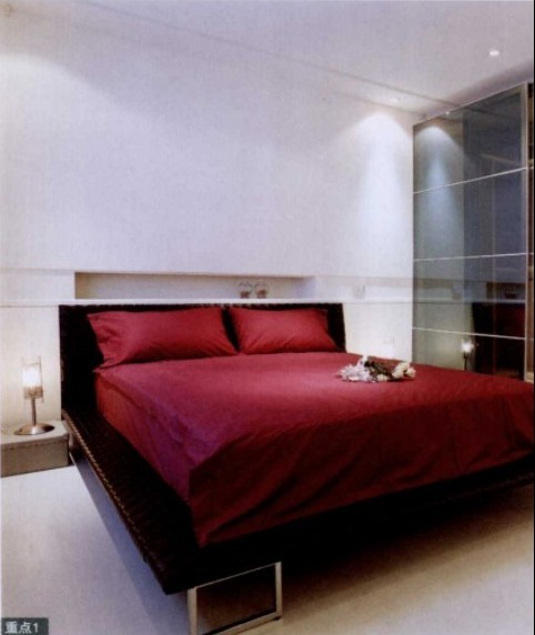 主臥與更衣室屬于狹長格局,因為兩個空間互通,因此刻意設計一面斜墻讓臥室的面積變大,同時選擇藍色鏡面玻璃拉門作為更衣室門片,當更衣室內燈關閉時,借由鏡面反射加大臥室空間。