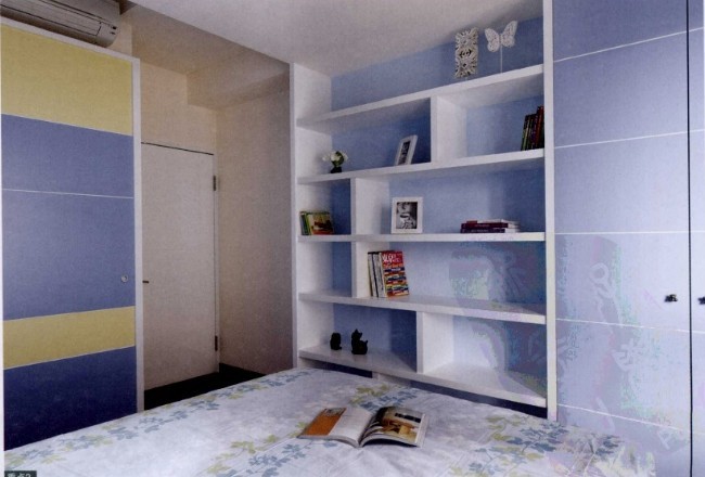 因為兒子的有專用的書房,臥室就只作睡眠使用,所以收納以衣物和玩具為主,為此設(shè)計了展示柜及衣柜,并選擇活躍的色彩來點綴。運用黃色及藍(lán)色的門片,空間更活潑。