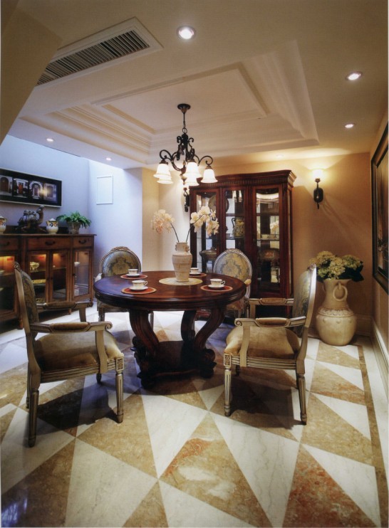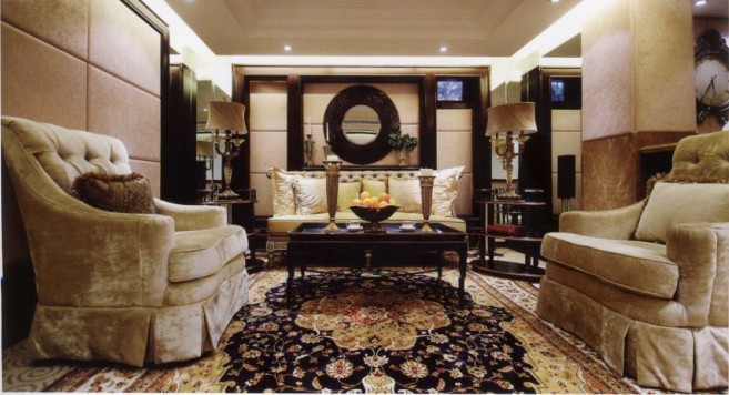 新貴族式風(fēng)格是尊貴、端莊的,因此對于材質(zhì)的選擇很是考究。大廳和公共區(qū)域的地面,以及衛(wèi)生間的墻面、地面,通常采用花崗石材拼花鋪貼。而臥室則采用滿鋪的羊毛地毯,或者實(shí)木地板結(jié)合手工塊毯鋪地。