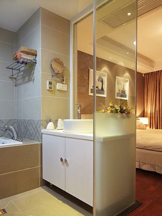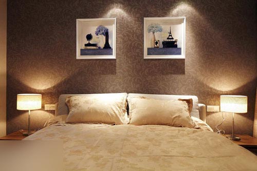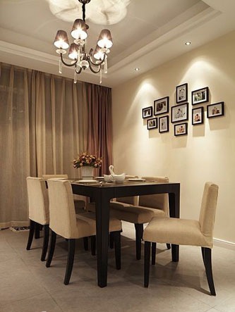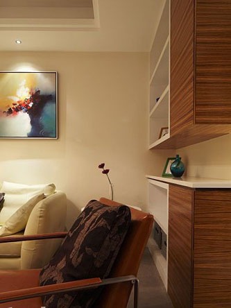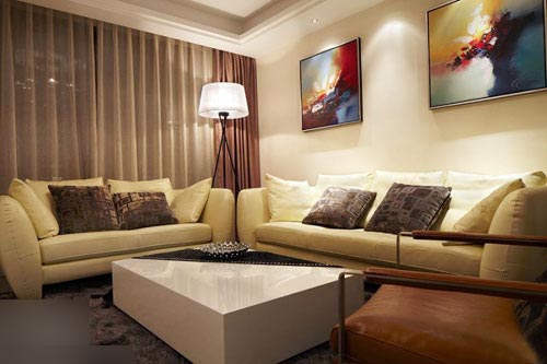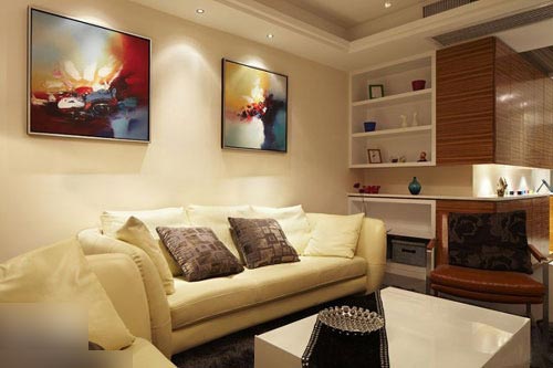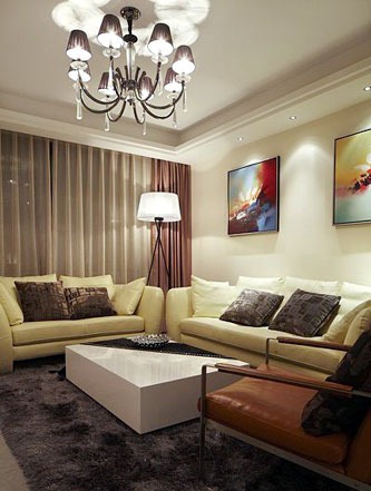 一進房間,整個空間給人一種清爽不失高貴的感覺??蛷d區(qū)域墻面沒有做過多的裝飾,墻面采用米黃色的油漆,客廳的吊頂也沒有做的太復(fù)雜只是在墻的邊角走了一圈邊,做成上下疊級的吊頂,并配上水晶吊燈,奶油色的布藝沙發(fā)搭配深色靠墊,既簡單又富有現(xiàn)代感。一個漂亮的落地燈照亮整個房間又起到了很好的裝飾做用,一舉兩得。沙發(fā)背景墻沒必要做的復(fù)雜,掛上兩幅簡單油畫,現(xiàn)代感極強。
