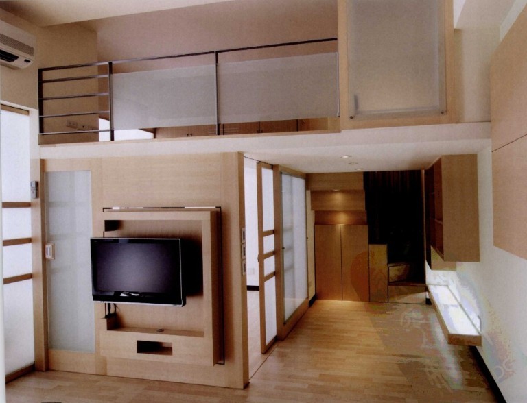 夾層上方采用開放式設(shè)計手法,于兩側(cè)規(guī)劃有大量收納儲物柜,以解決小空間收納不足的問題